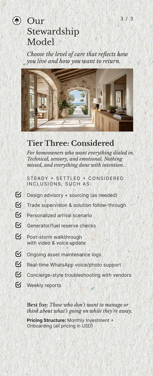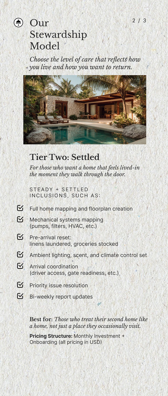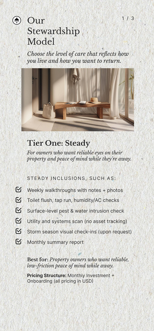 I saw an opportunity to design a new operational model: a personalized estate stewardship system that delivers peace of mind, readiness, and reliability for absentee property owners.