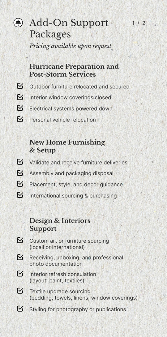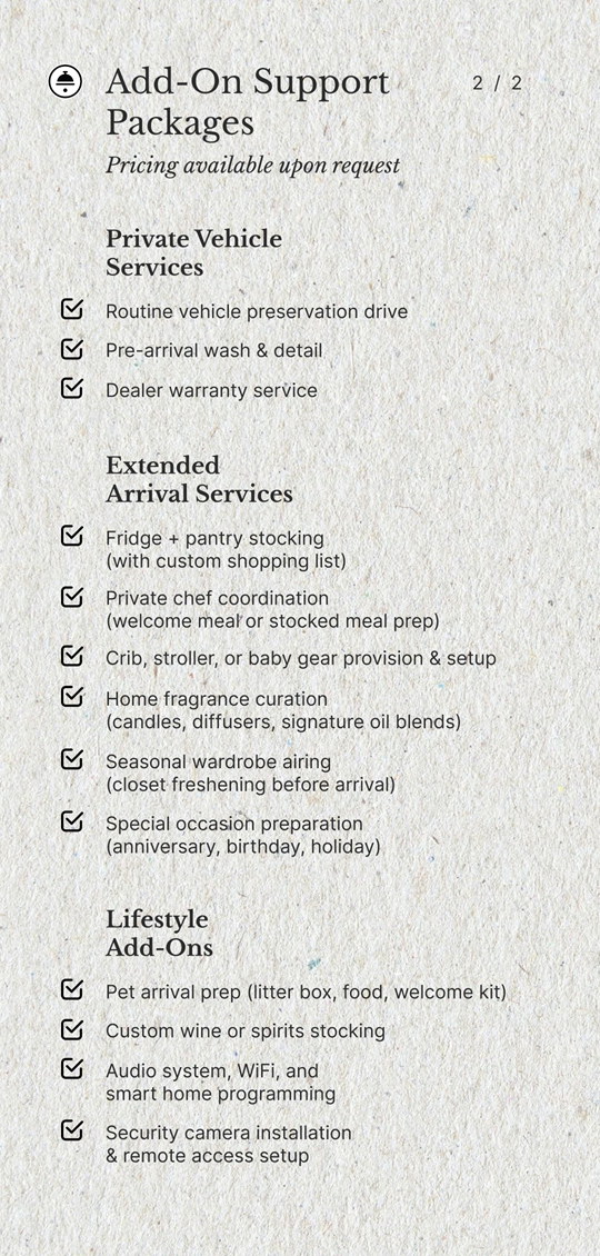Together with my wife Rochelle, a brand and design expert, I co-developed a full-service home stewardship program that merges hospitality precision with executive-level accountability.